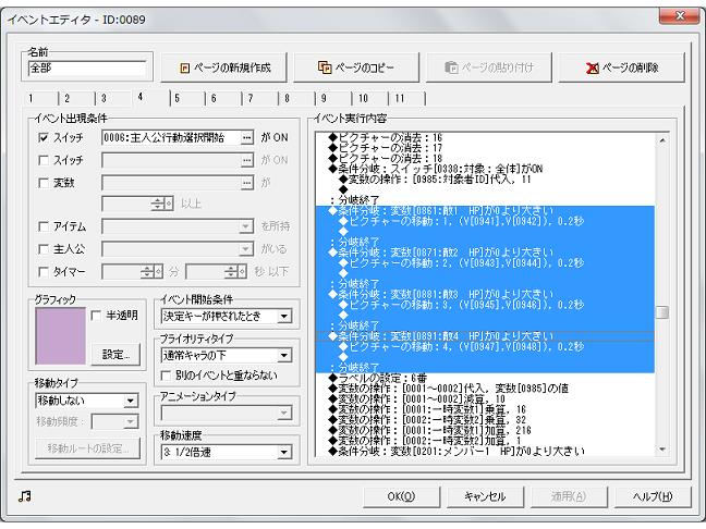 こうなってしまえば、後はHSPのプログラミングで自由に扱えるので、たとえば似た構文をひたすらコピーしたり、条件に応じて値をちょっと変えてみたり、ということがだいぶん楽に出来るようになります。